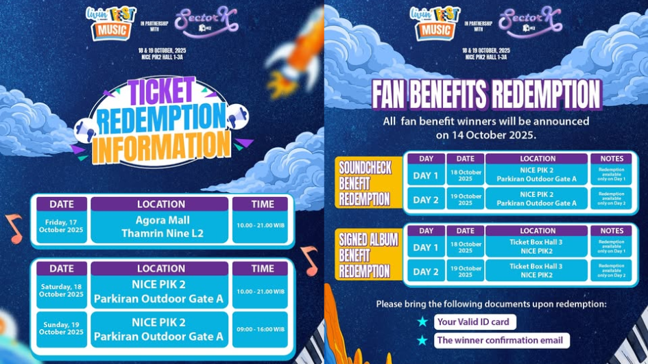- Sabtu, 18 Oktober 2025: Hanya untuk penukaran tiket Day 1 pada pukul 10.00-21.00 WIB