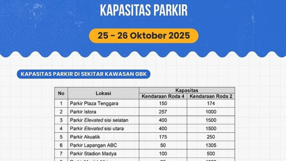 Berikut kantong parkir lengkap dengan kapasitas yang disediakan di sekitar kawasan GBK saat pelaksanaan JRF 2025.