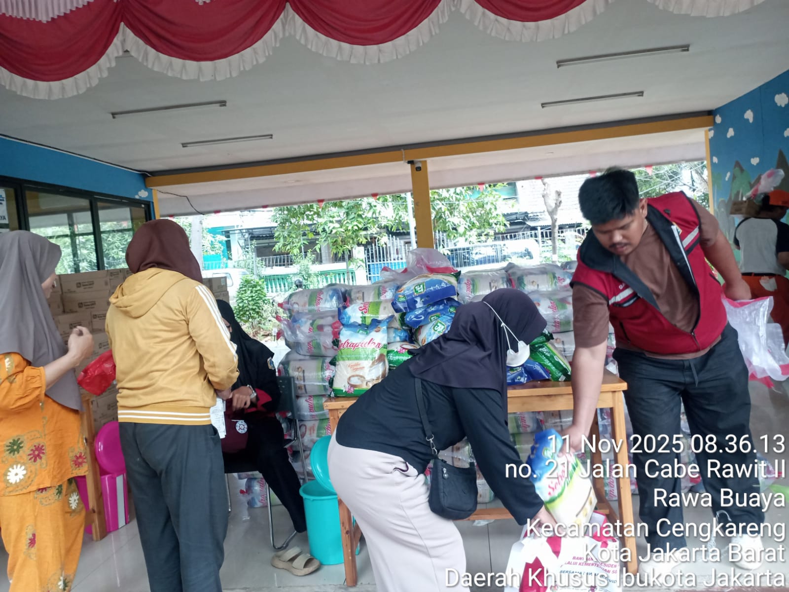 Pada Selasa pagi, pendistribusian paket pangan dilakukan. Warga menerima berbagai bahan kebutuhan pokok, antara lain beras, ayam, ikan, daging sapi, telur, dan susu. Seluruh proses berjalan tertib dan teratur dengan dukungan pengamanan dari Satpol PP Kelurahan Rawa Buaya.