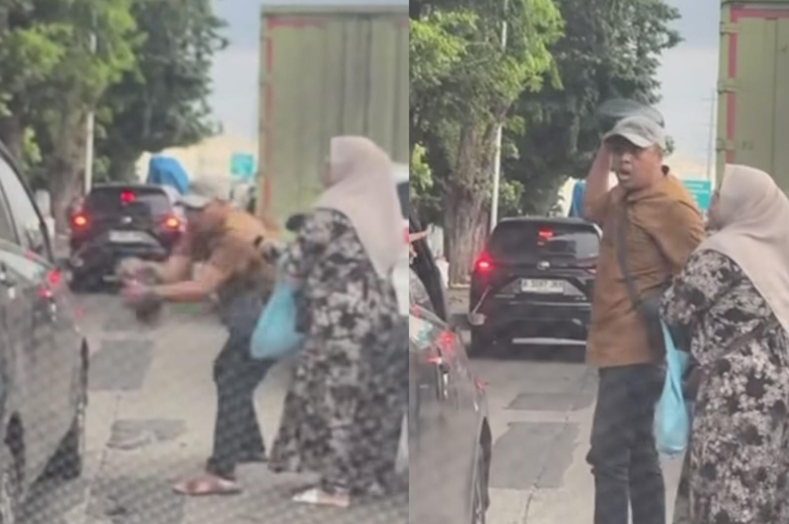 Dalam unggahan video itu terlihat seorang bapak-bapak mengenakan baju warna coklat, celana hitam dan memakai topi tiba-tiba menarik spion mobil. Terlihat dalam aksinya tersebut sempat ditahan oleh seorang ibu-ibu yang mengenakan hijab.